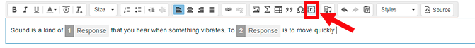 C In the Possible responses boxes, type the fill-in-the-blank words or terms. G To remove a possible response, click the Remove attribute button H To include additional responses, click D If a single answer choice is allowed for more than one fill-in-the-blank option, select the Reuse responses check box. E In the Set correct answer(s) box, specify the correct answer(s). As you create the item, it displays at the bottom of the page. Click to see an example of a completed Fill in the Blanks item. |