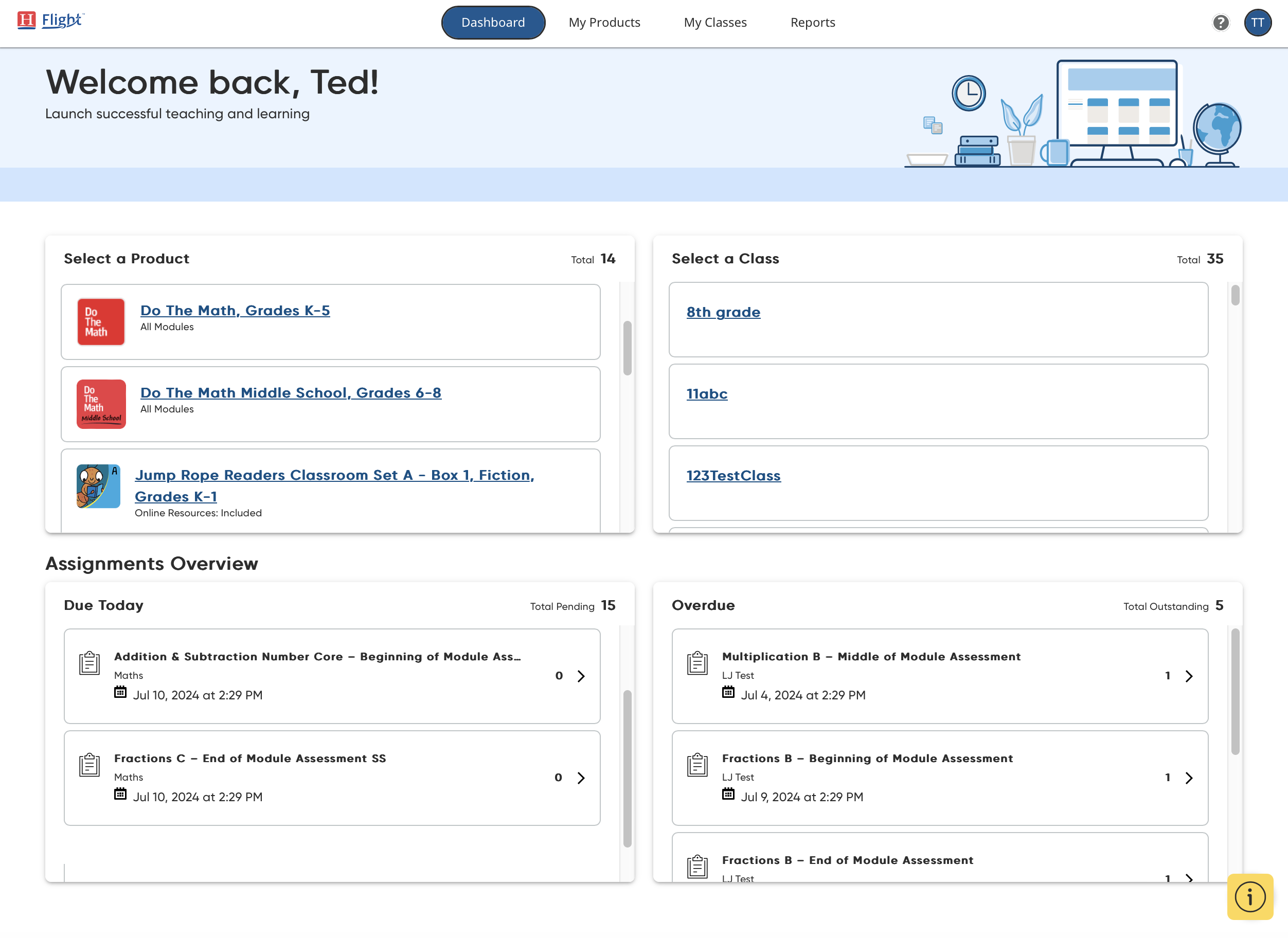 The Teacher Dashboard contain three main elements: Select a Product Widget, Select a Class Widget, and Assignment Overview.