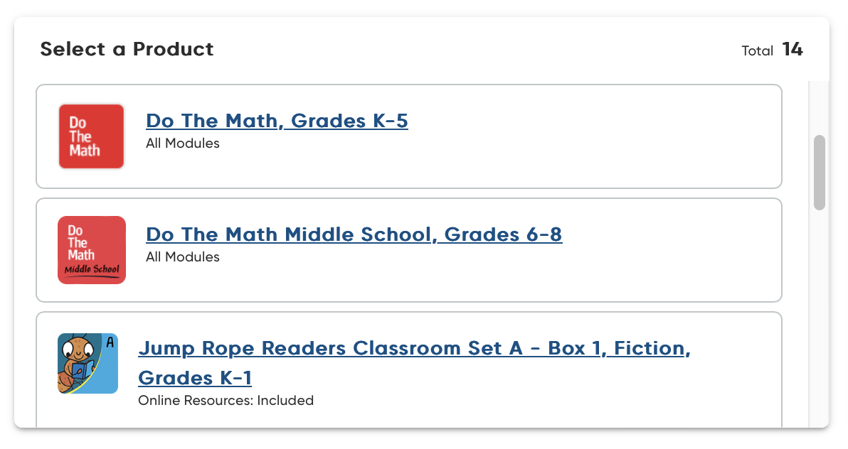 The Select A Product widget allows teachers to see all portfolios and products that they have licenses for. Clicking the product card takes users to the My Products page for the selected product.