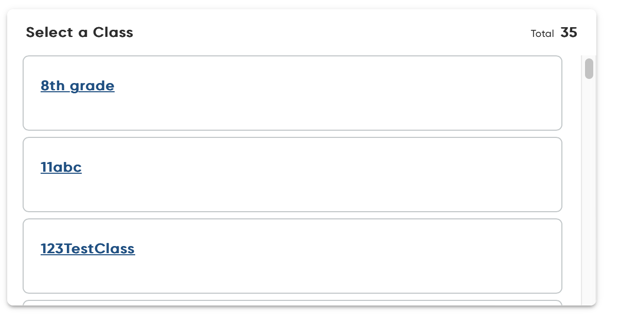 The My Classes widget displays all of the teacher’s classes. Clicking a class name opens the My Classes page to the selected class’s view.