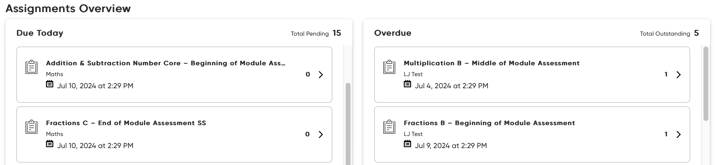 The Assignments Overview widget alerts teachers to assignments that are due today or past due. The widget allows teachers to quickly assess what work the class currently needs to complete and what work is ready for grading.