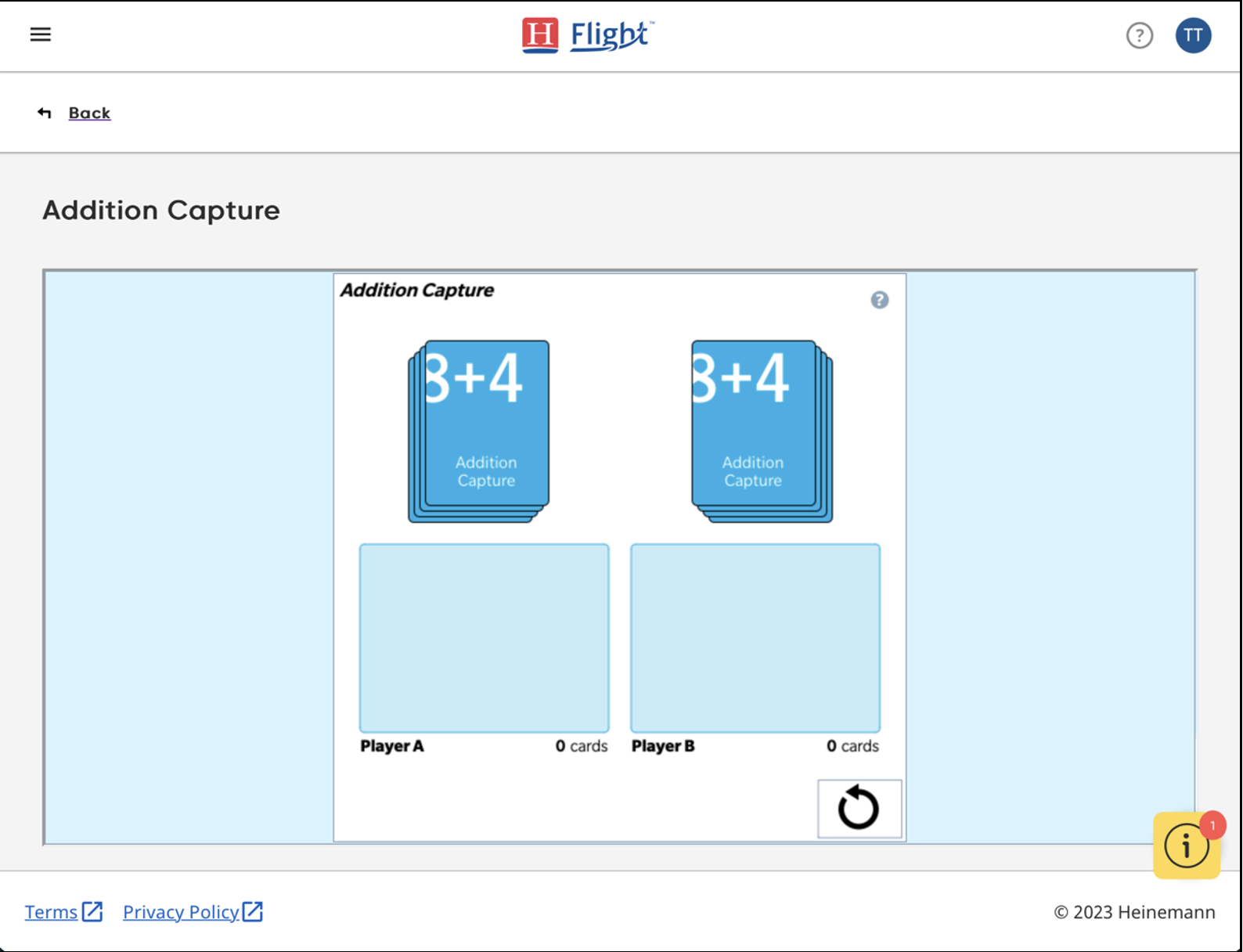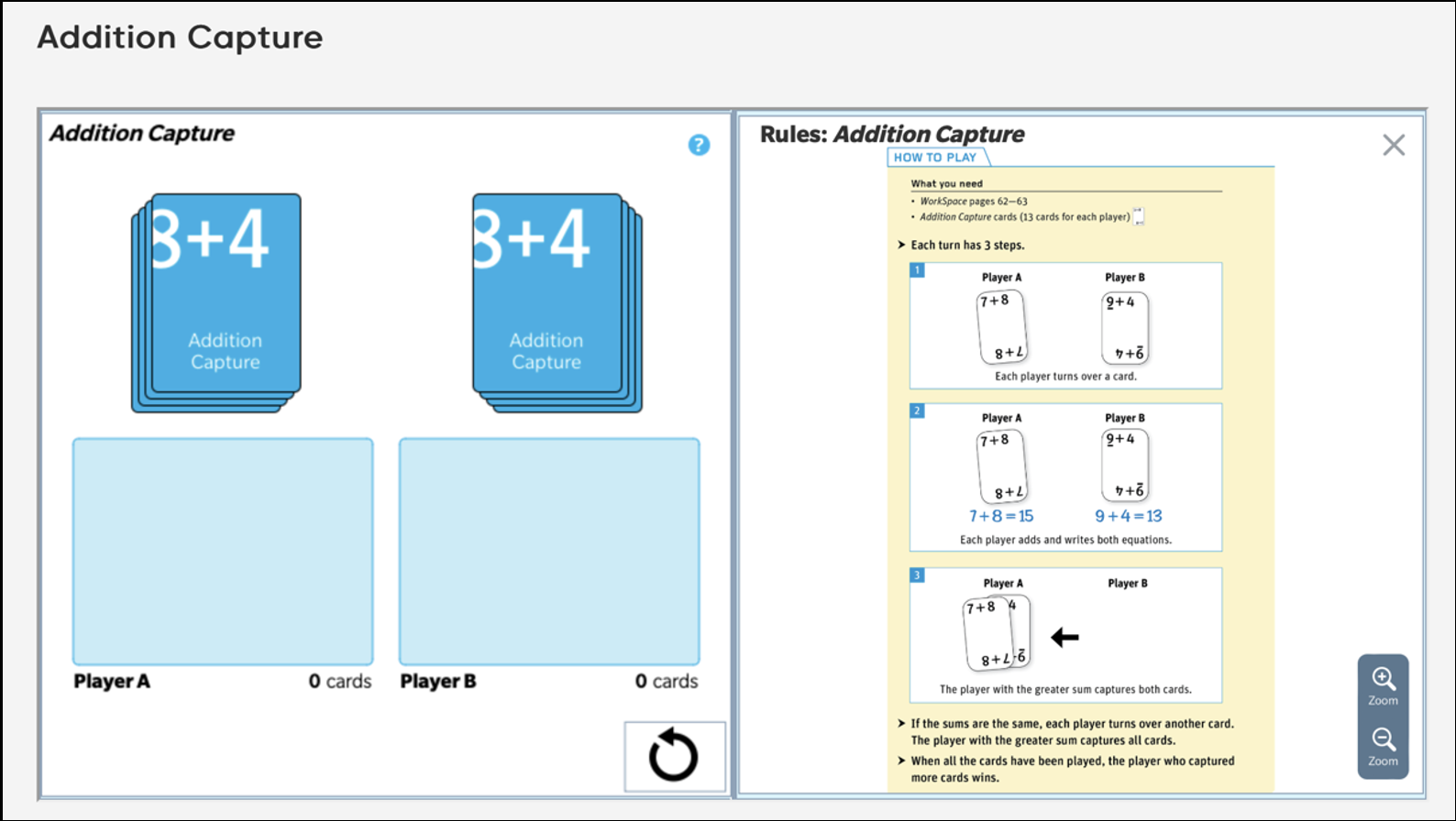 All games contain a Reset button (the curved arrow button) which clears the game screen and a toolbox icon where game manipulatives or tools can be dragged to remove them from the screen.