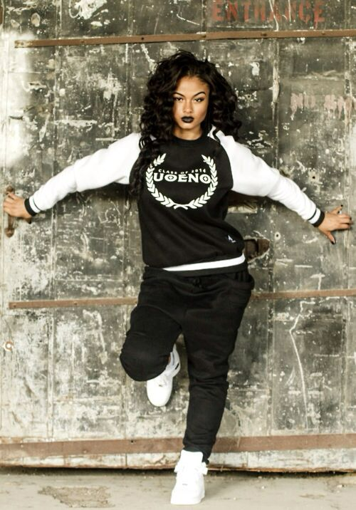 - Black crop hoodie with white cami/leotard.