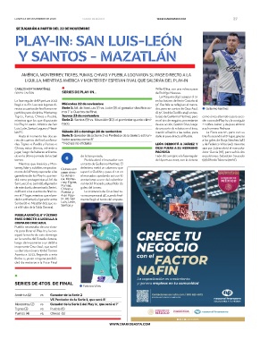 mientras que los que disputarán Serie 2: Santos (9) vs. Mazatlán (10): el perdedor queda elimi- en el tiro de esquina, proveniente der a zona de Play-In, y la consiguió