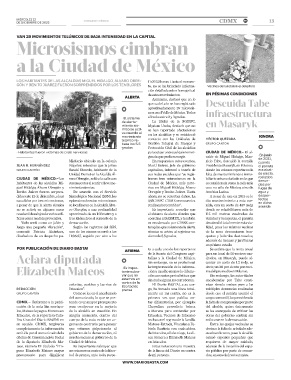 a pesar de que la alerta sísmica se localizaron en la alcaldía Álva- realizando recorridos". nida, con un costo de 487 mdp avenida