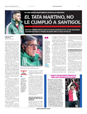 esa plática comencé a hacer las ● G. Martino prometió a Santi llevarlo a Qatar un auténtico delantero", decla- el puesto 62, por encima de ju-