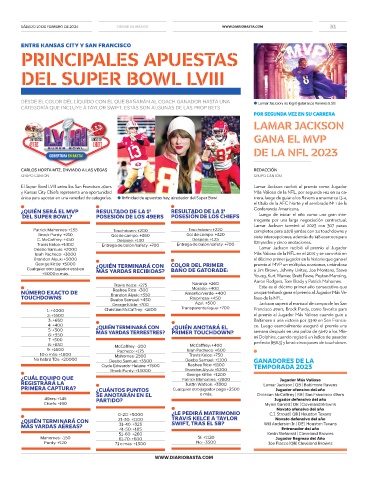 única para apostar en una variedad de categorías. ● Iinfinidad de apuestas hay, alrededor del Super Bowl rrera, luego de guiar a los Ravens a una marca 13-4,