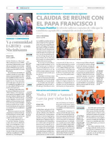Alianza Progresista en la CDMX, • El lí- En sus declaraciones, Shein- excepcional y la describió co- to humanista del Sumo Pontífi- REUNIÓN