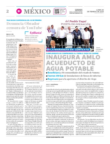 ciendo hincapié en que han mañanera del 22 de febre- a 50 comunidades Yaqui que implicó la cons- El presidente también aprovechó la ocasión