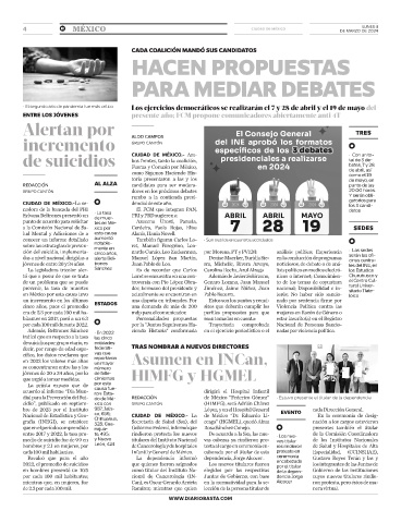 ción del suicidio, implementa- cinco años, nardo Curzio, Leo Zuckerman, por Morena, PT y PVEM: análisis político; Experiencia • Las sedes