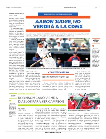 para los juegos ante Pittsbur- ● Aaron Judge jugará con Yankees ante Piratas y Mets en EU, mismos días de sus compromisos contra Diablos en CDMX