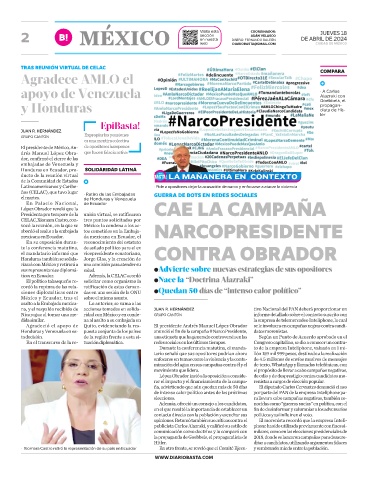 Honduras y Venezuela en es- puesta conjunta de los países anunció el fin de la campaña #NarcoPresidente, datos morenistas.