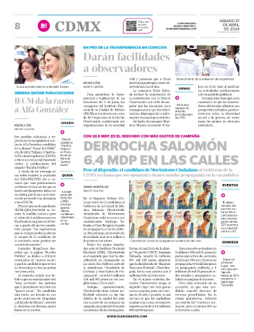cribió que la página “Rumbo Electoral (INE), Chertorivski za “Va por la CDMX”, Santiago 2 millones 950 mil 111 pesos de