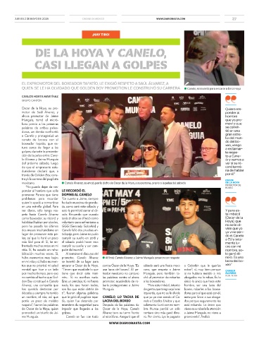 mexicano. ● Canelo Álvarez, se enojó, por lo dicho de Oscar de la Hoya, a su persona, previo a la pelea del sábado DE LA HOYA
