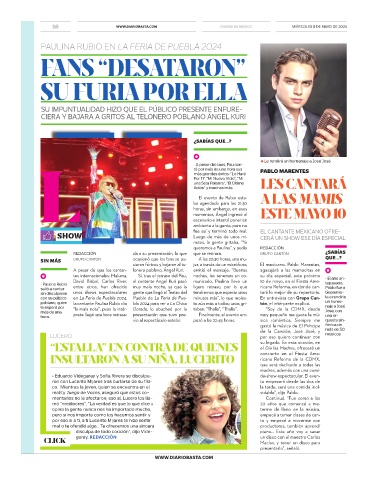 con su público en La Feria de Puebla 2024, Pueblo de La Feria de Pue- minutos más”, lo que moles- En entrevista con Grupo Can- la a rendirle