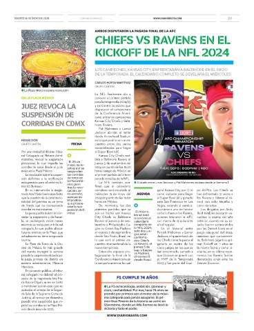 está prevista para el próximo lu- la Plaza Mé- La NFL también con- ● El duelo entre Lmar Jackson y Pat Mahomes iniciara desde la Semana 1