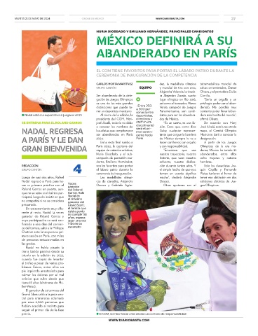 Nadal regresó a París para ha- cas de clavados, Alejandra Orozco. ediciones distintas de Jue-