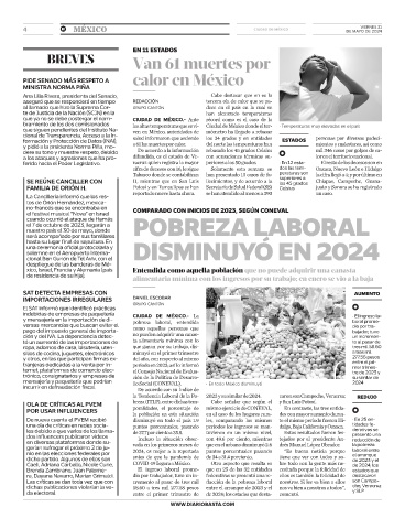 y pidió a la prsidenta Norma Piña, mo- a 61 las muertes por calor. del norte las temperaturas han mientos y malestares, así como