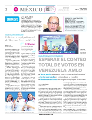 •Primera medalla para México en Juegos Olímpicos de París Obrador envió su felicitación al pueblo venezola- ro por los resultados de las elecciones.