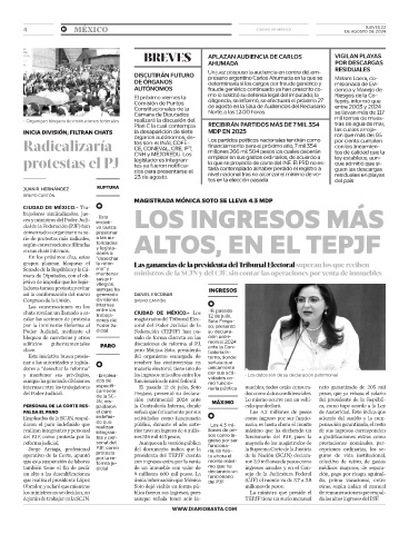 dejarán de trabajar en la SCJN. aunque señala tener seis in- TEPJF tiene un suelo mensual da los altos ingresos del PJF.