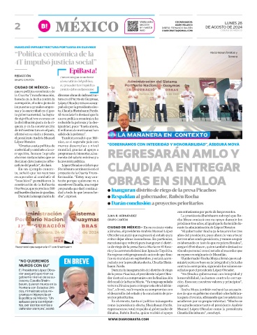 mencionó que volverá para inaugurar el distri- colaborando en todo lo que requiera Sinaloa”,