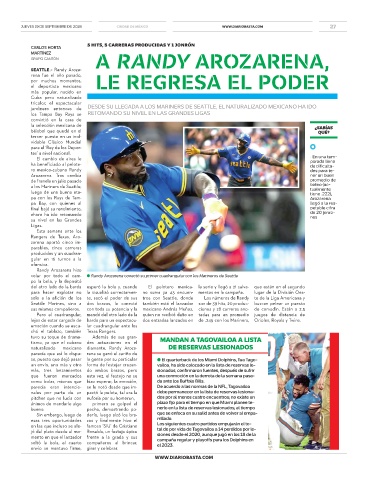 volar por todo el cam- ● Randy Arozarena conectó su primer cuadrangular con los Marineros de Seattle
