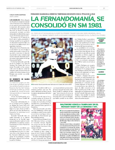 Valenzuela brilló en el campeonato las páginas más gloriosas del beisbol nager Tommy Lasorda el viernes 23 ción de Fernando Valenzuela con los su último en-