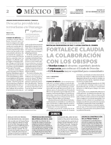 ahí con la Sedena, y Sinaloa se gia de pacificación. “Sinaloa cado por la creciente violencia contra la Igle- A su salida, Sheinbaum agradeció a la CEM