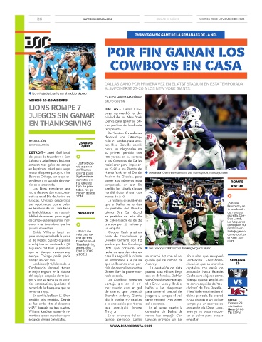 segundos del final, y permitió ante Lions (5-7), que cortaron una ● Los Cowboys celebraron el Thanksgiving con triunfo