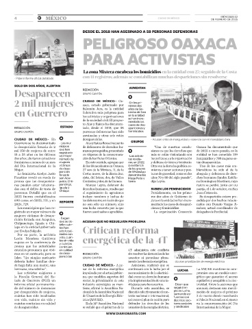 CIUDAD DE MÉXICO.- En desaparecidas. • Acusan crisis de inseguridad y violencia con el mandatario Jara