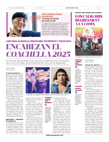 EN COACHELLA Junior H, el hit mundial “Lad- chella, Cali- en el mítico Teatro Roxy de metros" y "Razón" pidieron a