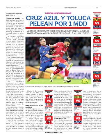 semestre, pues de la mano ● Toluca es líder del torneo y Cruz Azul es segundo, ambos va por el premio extra del millón de dólares Hora: 21:00