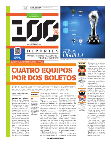 Play-In son Monterrey, Pa- terse a liguilla. la ilusión de avanzar a la Li- sucederá en el juego de ida,