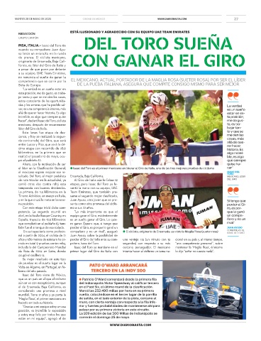 En su trayectoria como profesio- compañero y no un rival”, aseguró ● El ciclista, originario de Ensenada, ya viste la Maglia Rosa (sueter rosa) COMPAÑERO DE