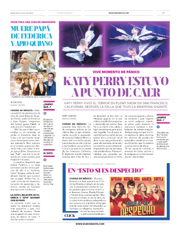noticia la dio Federica así: mo dice la cantante Katy Perry ha vivi- Perry se aferró a los cables y estructura comenzó a tam-