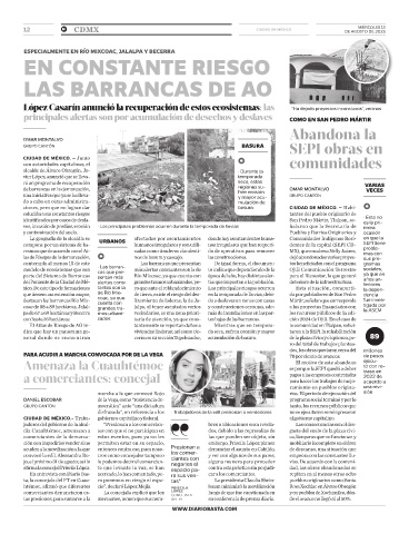 destacan las barrancas Río Mix- coac, ya que lizamiento de laderas; la de Ja- do a deslaves en zonas con casas Mártir, señalan que corresponde fue inves-