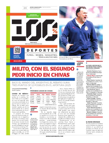 PEOR INICIO EN CHIVAS • Gabriel Mi- tos de 12 posibles (2 empa-