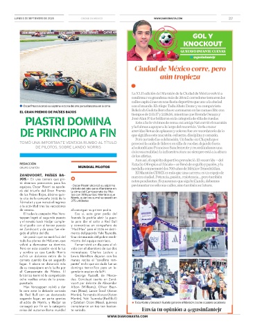 al adiós de Norris, y Hadjar se y Esteban Ocon (Haas), quienes ● Tadu Abate y Bekelech Gudeta ganaron el Maratón; bache ocasiona accidente