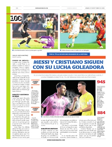 Lionel Messi y Cristiano Ro- EL 10 ANOTA DOBLETE PARA LLEGAR A 884 GOLES Y DIO ASISTENCIA, MIENTRAS QUE EL 7