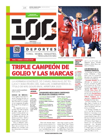 leño Joao Pedro se convirtie- 82.4 mins. ; | Invierno 1998 | América | 2010 | Chivas | 10 goles • Armando González, con 22