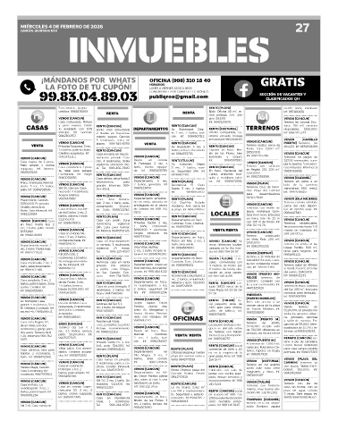Inf. 9982453980. recámaras, 2 baños. Inf. hrs. Inf. 9988901234. ................................................ Gran Plaza. Inf. 53 59 08 ............................................. del Sur. 200 m², listo para