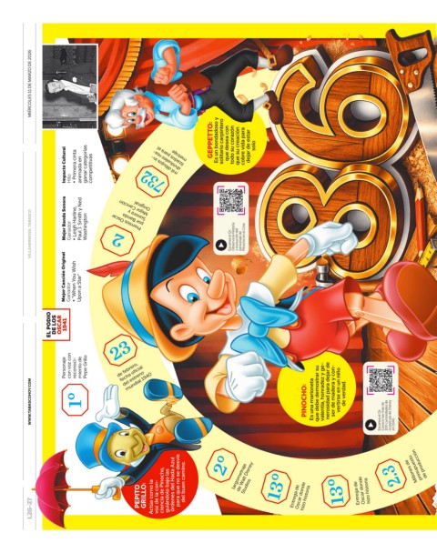 WWW.TABASCOHOY.COM 1° PINOCHO: Es una marioneta que debe demostrar su valentía, honradez y ge- nerosidad para dejar de ser de madera y con- vertirse en un niño de verdad. Escanea el Qr: Conoce las más de 100 curiosidades de la película de Disney en 1940. “Pinocho” (1967 “Pinocho de Guiller- mo del Toro” (2022)