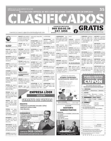 ó envíe su correo a ejecutivotabhoy@gmail.com HORARIOS: L-V: 9.00 A 18.00 SAB: 9.00 A 13.00 Clasificados Tabasco Hoy