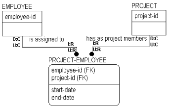 The referential integrity rules captured in the figure show the business decision to cascade all deletions in the PROJECT entity to the PROJECT-EMPLOYEE entity. This rule is called PARENT DELETE CASCADE, and is noted in the figure by the letters D:C placed at the parent end of the specified relationship. The first letter in the referential integrity symbol always refers to the database action: I(Insert), U(Update), or D(Delete). The second letter refers to the referential integrity option: C(Cascade), R(Restrict), SN(Set Null), and SD(Set Default).