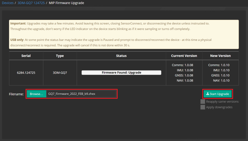 Firmware upgrades are available in .zhex format. The latest zhex can be found in the Downloads section on the 3DM-GQ7-GNSS/INS product page: