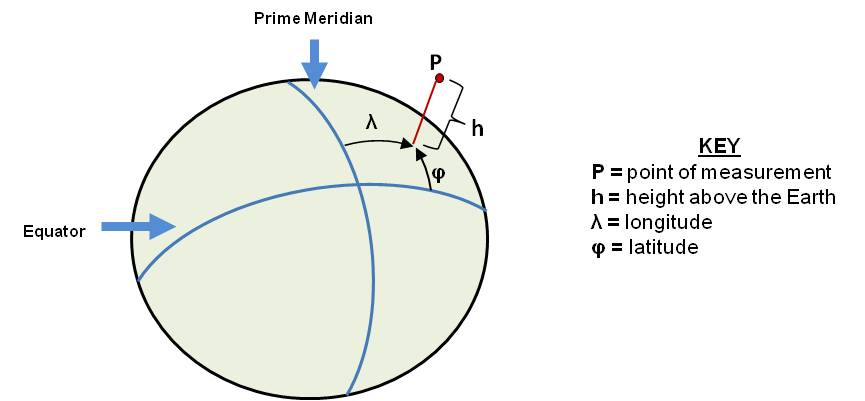A point (P) on or above the Earth in the WGS84 coordinate system is notated as: latitude (φ),longitude (λ), and height above the reference ellipsoid (h).