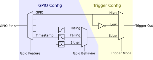 The GPIO trigger monitors one GPIO pin and can activate while the pin is low or high (state mode), or can activate briefly for one event tick when the pin changes state (edge mode). Among other things, state mode can be used to enable streaming by hardware, without having to send a MIP command. Edge mode can be used for obtaining precisely-timestamped data.