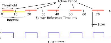 The final step is to configure an interval trigger. We'll set the data quantity to the Reference Timestamp (0xFF,0xD5) in the Sensor Data set. The interval will be the base rate divided by the frequency, or 1 kHz / 60 = 16.666667. For a 50% duty cycle, the threshold must be half of the interval, or 8.3333333. Note that since the trigger is updated once every event cycle, the state can only be updated with the granularity of one tick. As a result, for intervals that aren't exact integers, there will be some jitter from cycle to cycle. The average frequency however will remain accurate.