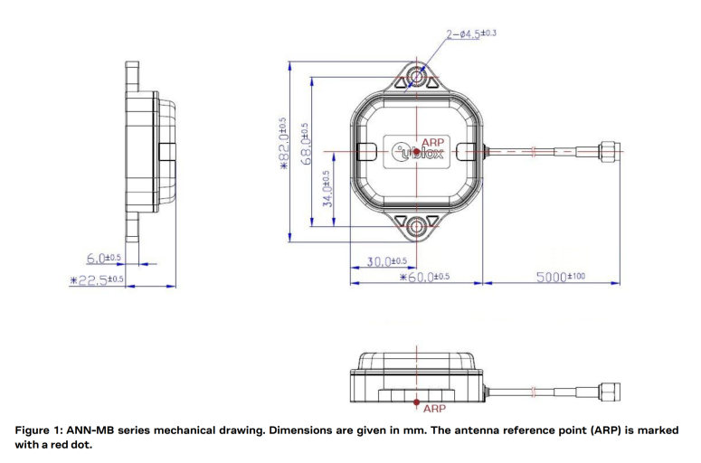 u-blox ANN-MB Mechanical Drawing: Antenna Reference Point