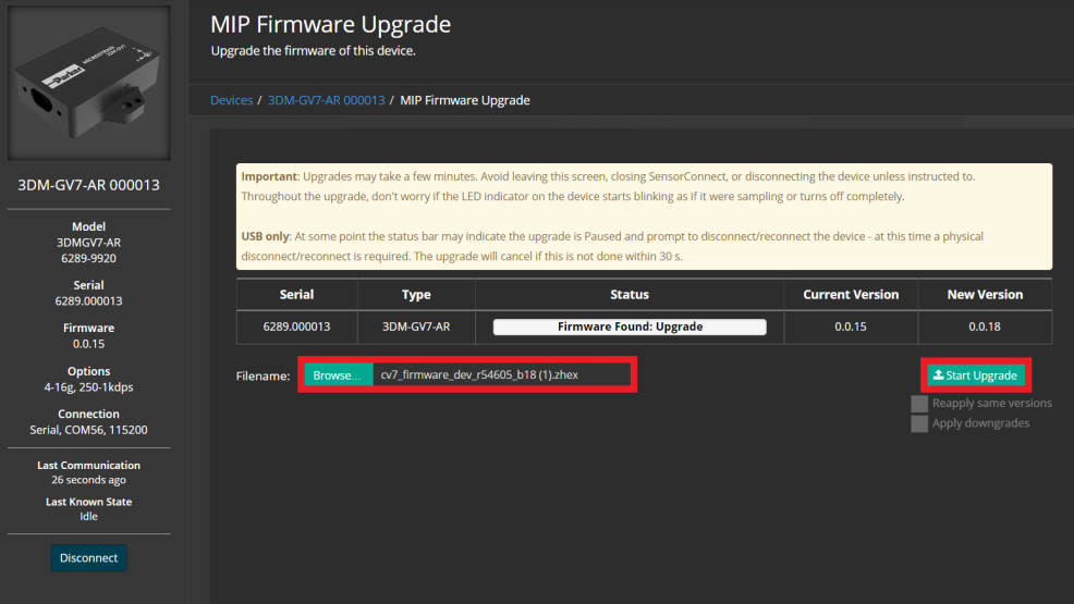 Firmware upgrades for the 3DM-GV7-INS will periodically be available through the product web page. For a simple Windows GUI - desktop option for applying firmware upgrades, SensorConnectâ„¢ (see Software) provides an easy to user interface for the 3DM-GV7-INS. For an embedded command line interface for Linux, or Windows, Inertial Upgrader CLI provides an executable that can be run directly from the command line.
